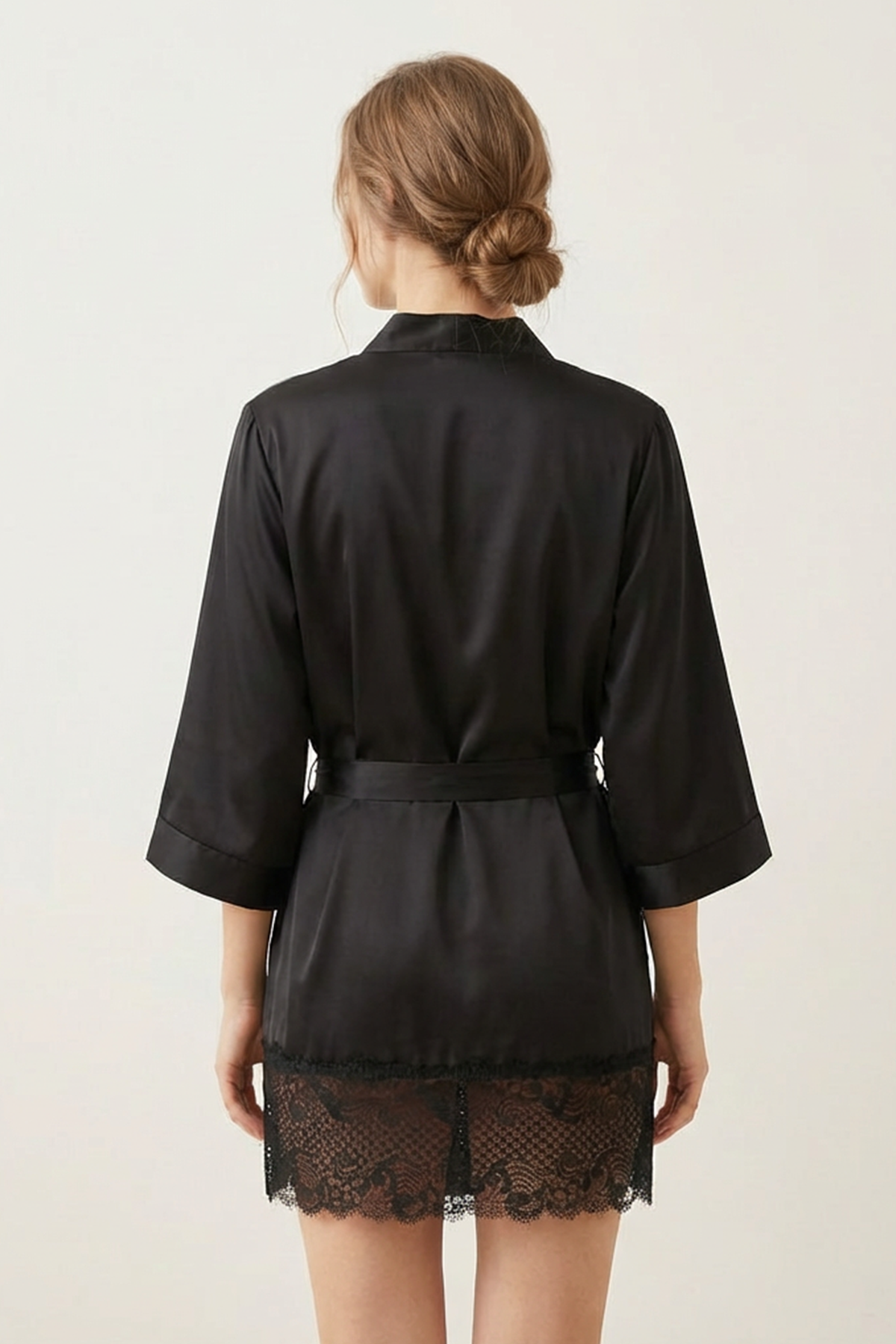 Designed for evenings that call for a hint of indulgence, this satin robe pairs refined minimalism with delicate lace detailing. The sleek silhouette is finished with a scalloped lace hem that adds subtle allure while keeping the look polished and wearable. Falling at thigh length with relaxed sleeves, it features a matching self-tie belt that allows you to wear it loose or cinched as desired.