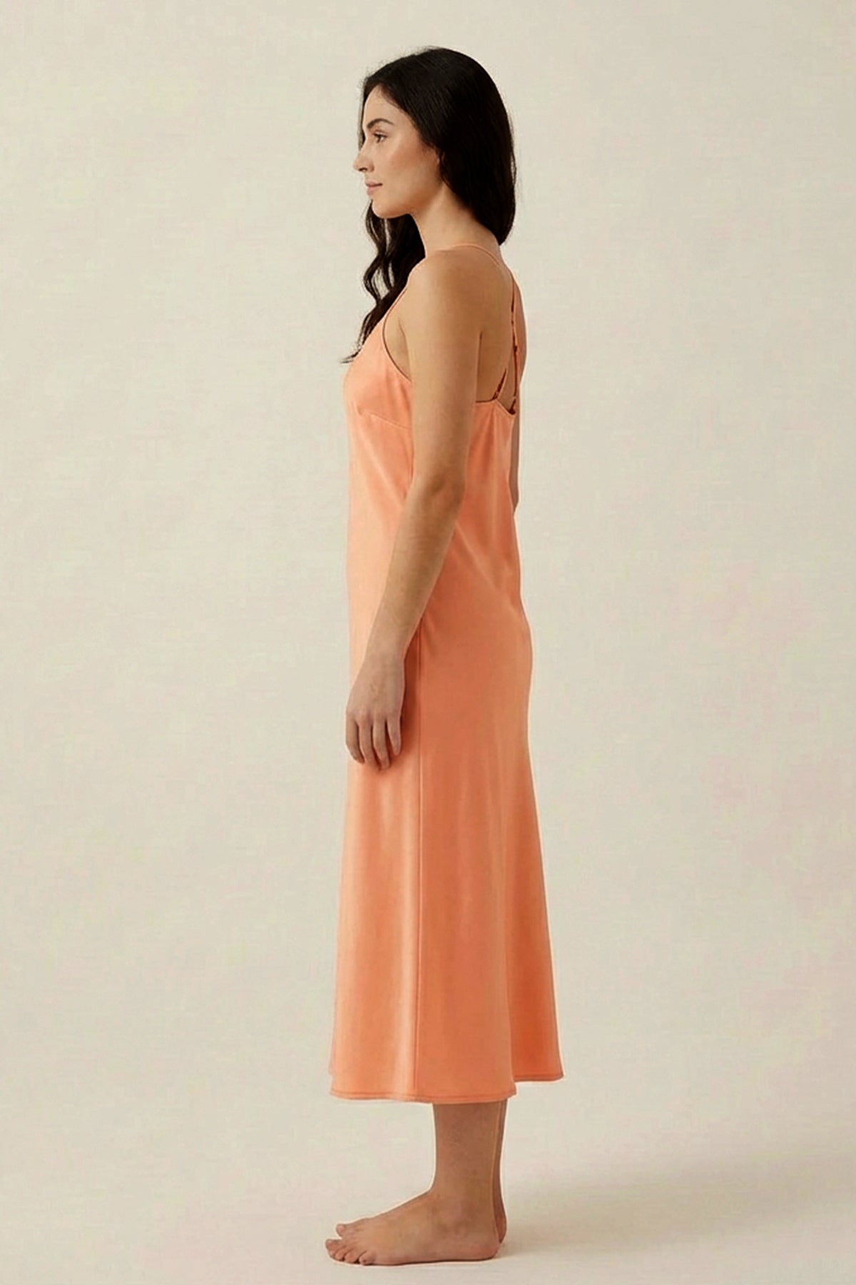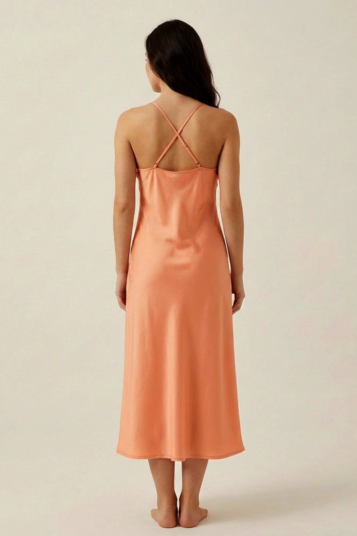 Designed for serene evenings and relaxed mornings, this satin midi dress brings together lightweight fluidity and understated charm. Falling gracefully below the knee, it skims the body with a smooth drape, while the adjustable slender straps offer a refined fit. The soft peach tone adds a fresh, feminine appeal, making it ideal for lounging or layering under a matching robe.