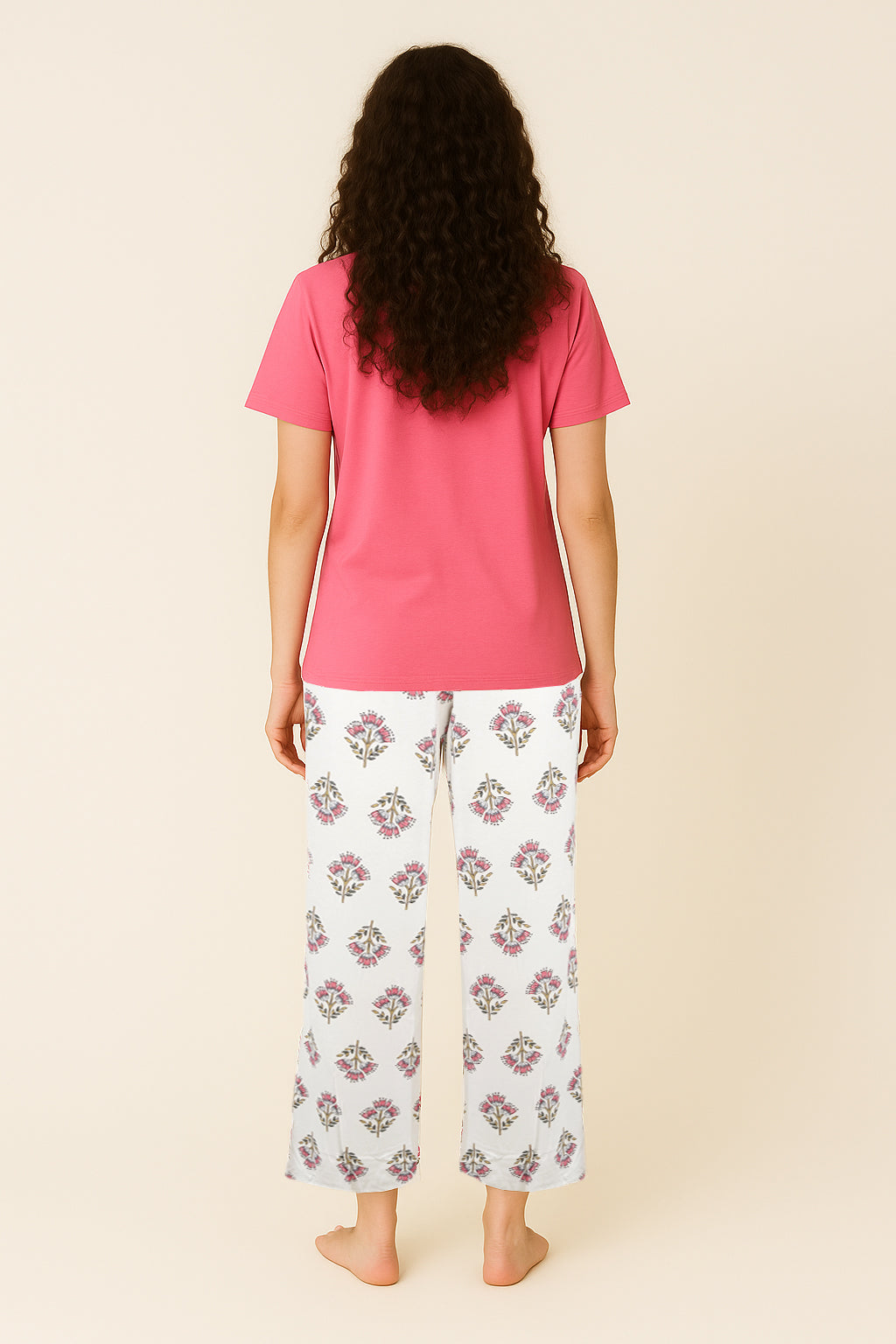 Brighten your downtime with the Camellia PJ Set, a cheerful coral-pink tee paired with ivory pajama pants blooming in delicate floral prints. Designed to keep you comfortable through long nights and lazy mornings, this set is made from a soft, breathable viscose-Lycra blend that stretches and moves with ease. The relaxed fit and lightweight fabric make it a perfect choice for year-round comfort.