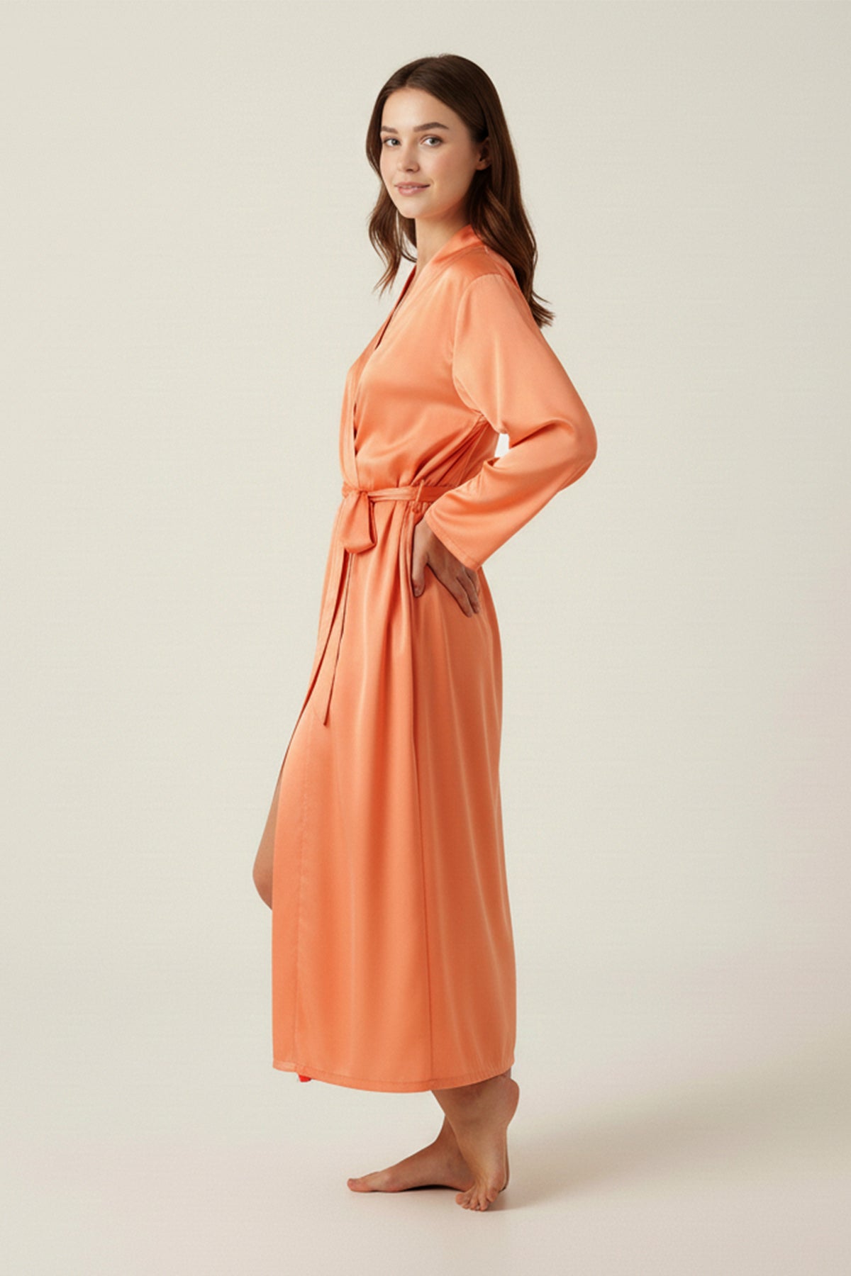 A graceful addition to your loungewear repertoire — this long satin dress combines quiet luxury with uninterrupted comfort. Falling elegantly to the ankles, it skims the body with a fluid drape and offers full coverage without compromising on softness. The relaxed long sleeves and self-tie waist belt allow for a customizable fit, while the subtle sheen lends a polished, serene look.