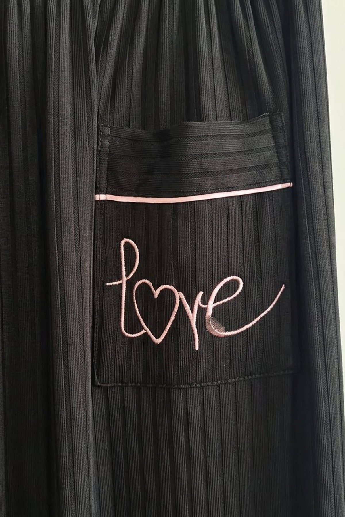 The subtle ribbed texture keeps it light and comfortable on the skin. The short-sleeve button-down top features contrast piping and a chest pocket with delicate embroidery, while the long pants offer a relaxed fit with an elastic waistband and adjustable drawstring.