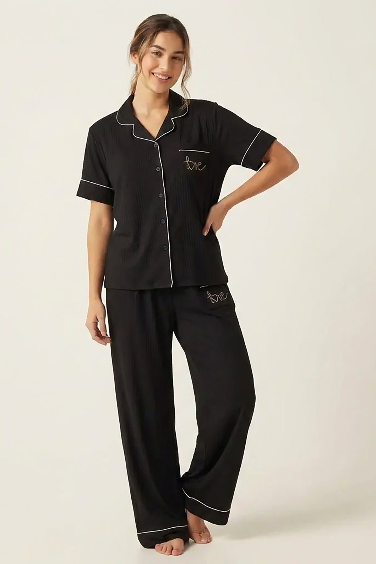 Perfect for sleep and relaxed days at home. Product Details: Soft ribbed cotton-spandex pajama set Short-sleeve button-down top Contrast piping on collar, sleeves, placket, pocket, and hem Chest pocket with embroidered detail Long pants with elastic waistband Adjustable drawstring for flexible fit Breathable, stretchable fabric for all-day comfort Ideal for sleep and lounge wear Composition: Cotton 95% Elastane 5% Shipping & Returns: Free shipping on domestic orders above PKR 9,999. Due to the intimate nature of this product, returns or exchanges are not accepted.