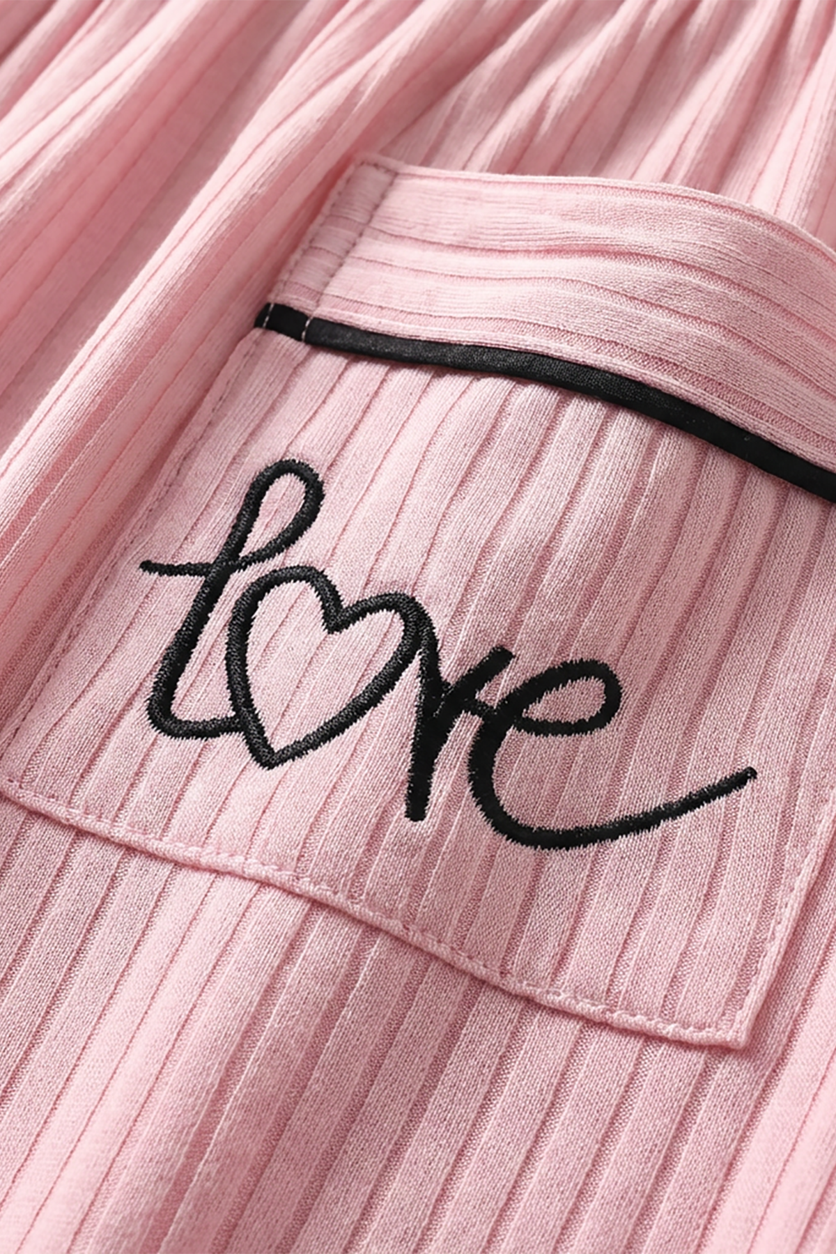 The subtle ribbed texture keeps it light and comfortable on the skin. The short-sleeve button-down top features contrast piping and a chest pocket with delicate embroidery, while the long pants offer a relaxed fit with an elastic waistband and adjustable drawstring.